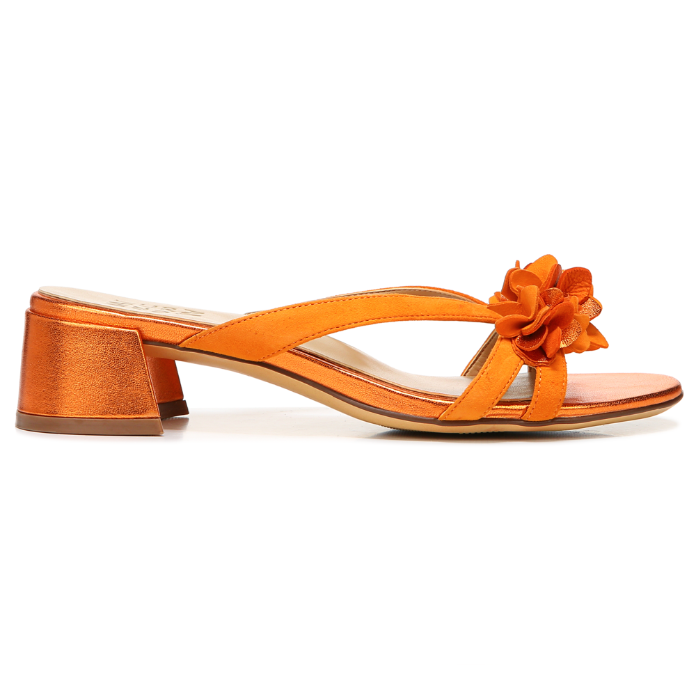 • Dressy slide sandal with floral details.
